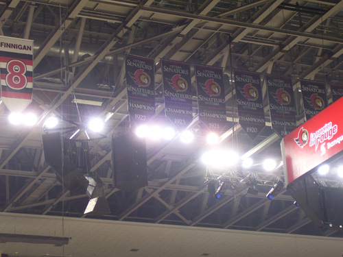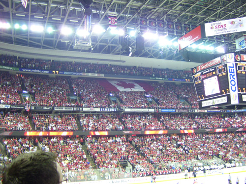 The anthems were great. Lyndon Slewidge always does a great job… the problem with trying to get the crowd to sing the anthem in Ottawa is we get the bilingual version and the Anglos don’t know the French parts, crap we barely know the freaking English parts… once the anthems were out of the way I was really surprised at the complete lack of ceremony. When I was at the 2003 Flyers v. Senators for Game Five there was a massive, chill-inducing multimedia presentation… the Senators appeared onscreen as gladiators and there was a suitable soundtrack. Very cheesy, but when Spartacat dropped from the rafters I nearly cried. This time the multimedia presentation was limited to some powerpoint images flashed on the ice, some spotlights and two songs where the crowd was supposed to sing along but Music Dude kept fucking up the timing… I actually don’t even remember if there was a ceremonial faceoff. I do remember there was a 600 foot wide Canadian flag that almost made it around the third level. That was pretty freaking cool. Then there was a faceoff and Chris Neil beat the Anaheim Ducks 5-3… oh, and Chris Pronger nearly killed Dean McAmmond.